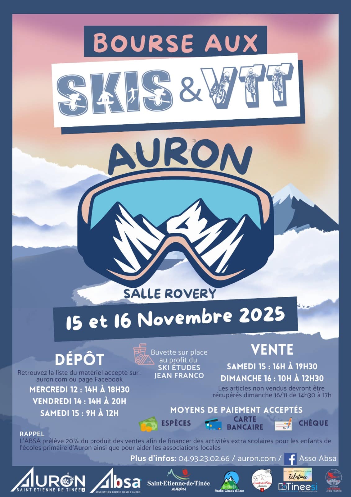 L’organisateur dégage toute responsabilité sur le matériel vendu en état : celui-ci n’est ni garanti, ni repris, ni échangé. Le règlement des articles se fait uniquement en ESPECES / CHEQUE / CARTE BANCAIRE L’ABSA, prélève 20% du produit des ventes afin de financer les cours de ski et des activités extra-scolaires pour les enfants de l’école primaire d’Auron « Marie-Laure BRUN » et les associations locales.