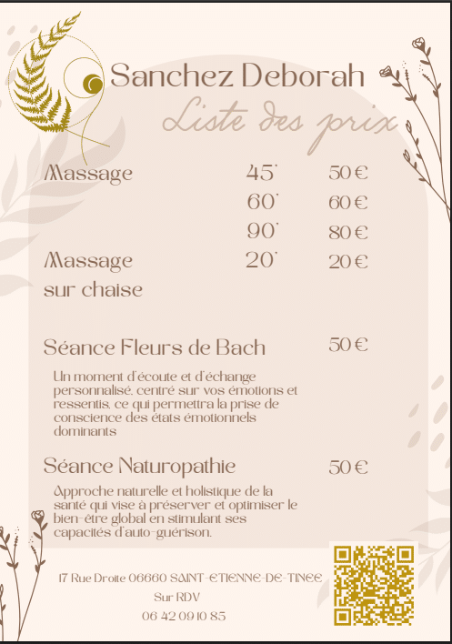 À travers les massages bien-être, les fleurs de Bach et des outils naturels d’accompagnement, Déborah vous aide à libérer les tensions, apaiser le stress et retrouver une harmonie intérieure durable. Chaque séance est personnalisée, à l’écoute de vos besoins du moment, pour vous offrir une pause profonde et régénérante.