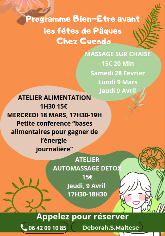 - Soins Bien être : massage détoxifiant – massage myofascial – massage thaïlandais – réflexologie plantaire