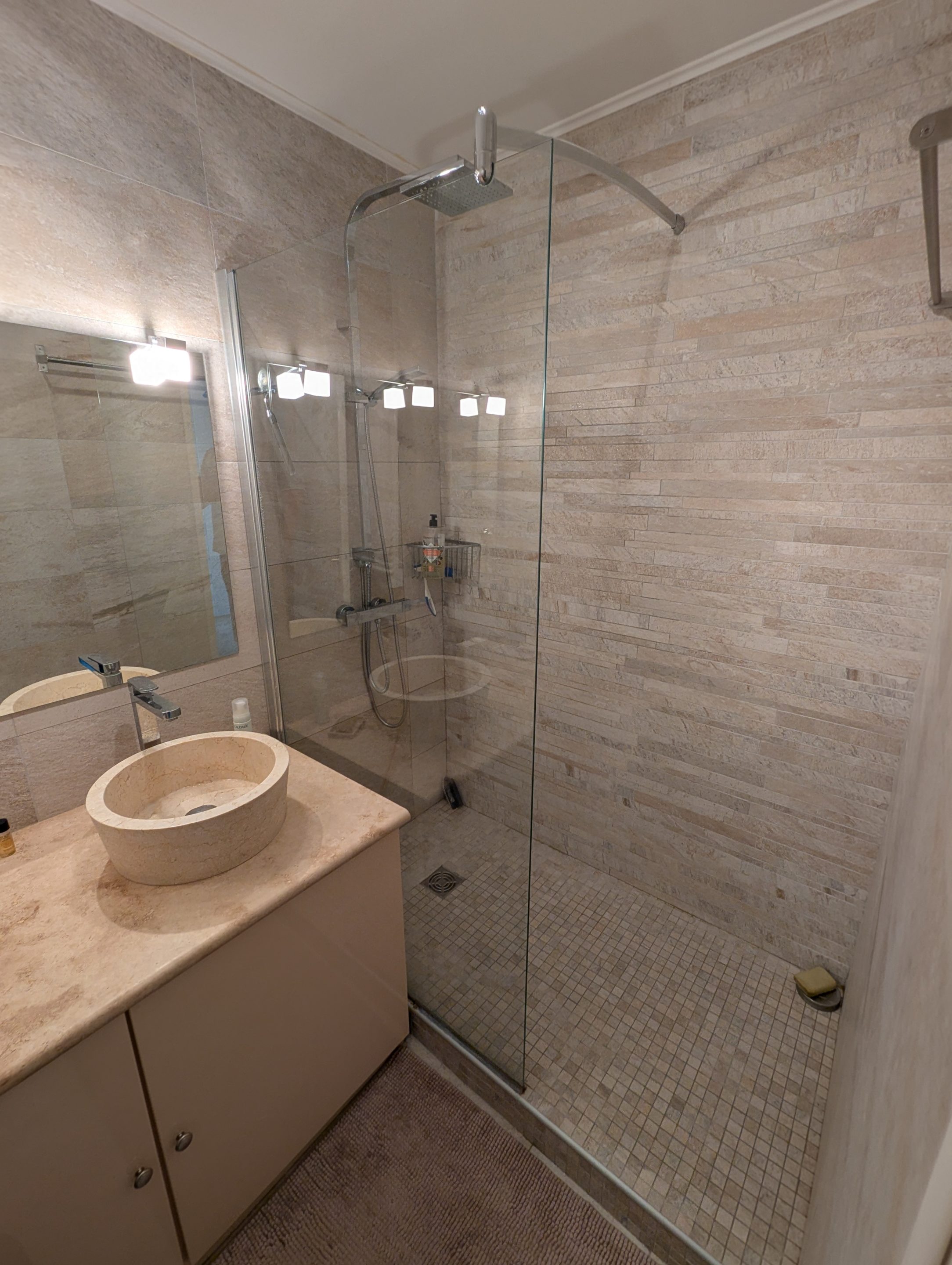 Salle de bain: douche à l’italienne, lave linge, sèche serviettes,
