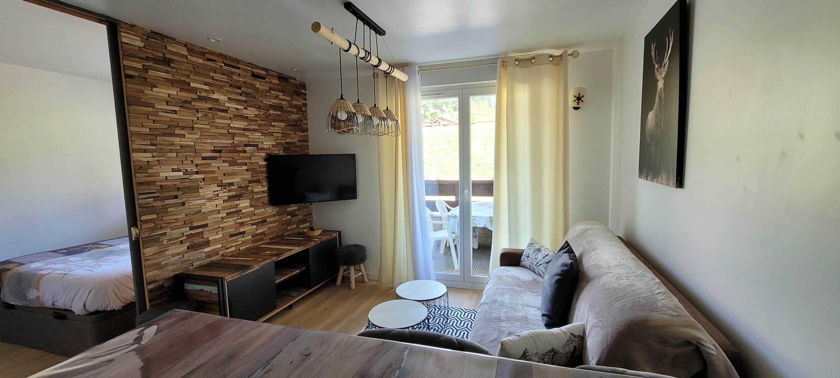 - Un coin salon avec un canapé lit 2 places et un écran plat